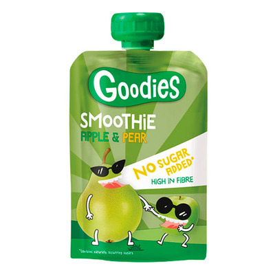 Goodies Pear & Apple Smoothie er en fruktpuré laget av eple og pære uten tilsatt sukker. Den har et naturlig sukkerinnhold fra frukten og er rik på fiber. Smoothien egner seg som mellommåltid for større barn og kommer i en praktisk klemmepose som gjør den enkel å ta med seg på farten. Produktet egner seg også godt som topping på grøten eller som et lett og friskt mellommåltid i løpet av dagen.