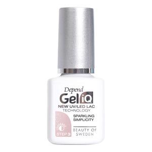 Depend Gel iQ i fargen Sparkling Simplicity er laget av en unik gelformel med UV/LED-teknologi som gir deg perfekte og glansfulle negler som holder i opptil 14 dager. Denne gellakken er spesialutviklet med en herdetid på 30 sekunder i UV/LED-lampen. Lakken har en opasitet som klassifiseres som "semi-opak", noe som fremgår av det lille runde symbolet i flaskens venstre hjørne.