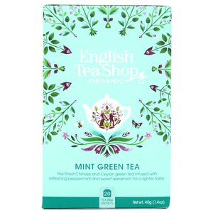 Mint Green Tea fra English Tea Shop er en herlig, økologisk teblanding basert på grønn te med en frisk vri av mynte og peppermynte. Teen har en frisk og virkelig deilig smak - vær oppmerksom på at produktet inneholder koffein. Denne varianten leveres individuelt pakket i 20 poser, som også er håndpakket i en bærekraftig, komposterbar pappeske.