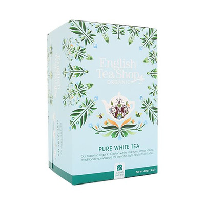 Pure White Tea fra English Tea Shop er en lekker, økologisk teblanding med 100 % hvit te. Denne varianten er individuelt pakket i 20 teposer i en bærekraftig, dekorativ pappeske.