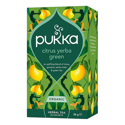 Pukka Citrus Yerba Green te er en frisk og energigivende økologisk blanding av grønn te, yerba mate og guarana med noter av appelsin, sitron og mynte. Kombinasjonen av sitrusfrukter og grønn te gir en lett og livlig smaksopplevelse som passer perfekt både morgen og dag.