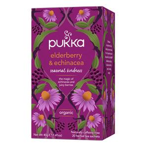 Pukka Hyllebær & Echinacea te er rik på antioksidanter og har et høyt innhold av virkningsfulle urter, bær og frukter. Teen er naturlig koffeinfri og etisk handlet.