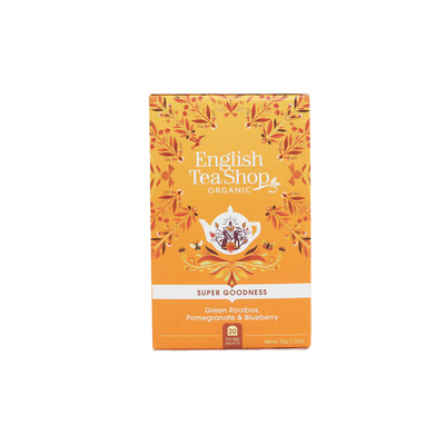 Green Rooibos Pomegranate fra English Tea Shop er en herlig, økologisk teblanding blant annet basert på grønn rooibos, hibiskus, pasjonsblomst, blåbær og granateple. En lekker, søt og fruktig te som passer til alle tidspunkter på dagen. Teen leveres individuelt pakket i 20 teposer i en komposterbar, dekorativ pappeske.