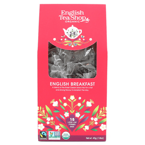 English Breakfast fra English Tea Shop er en rik teblanding med 100 % økologisk, svart Ceylon-te fra bærekraftig Fairtrade-produksjon. Den har en skikkelig fin smak som vil, som navnet tilsier, gi en god start på dagen. Teen er produsert med spesiell omtanke for miljøet, derfor er emballasjen også laget av bærekraftige og komposterbare materialer. Den leveres individuelt pakket i små pyramideposer, som gjør det enkelt å brygge en kopp te.