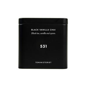 531 Black Vanilla Chai fra Teministeriet er en krydret og aromatisk te basert på klassiske chaikrydder med et hint av vanilje. Den inneholder blant annet kanel, ingefær, kardemomme, appelsinskall, rosepepper og naturlig karamellaroma. Teen leveres i en flott, sort tinnboks med hvit skrift som fint kombinerer gamle, østlige tetradisjoner med skandinavisk design.