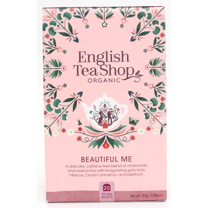 Beautiful Me fra English Tea Shop er en deilig, økologisk teblanding basert på blant annet kamille, gotu kola, hibiskus, kakao og velduftende roseblader med en frisk, syrlig vri av appelsin og tranebær. I tillegg inneholder teen kanel, som fullfører smaksopplevelsen på beste måte. Denne varianten kommer individuelt pakket i 20 poser, som også er håndpakket i en komposterbar pappeske.