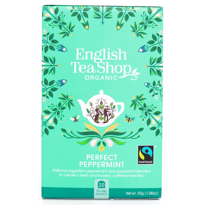 Perfect Peppermint fra English Tea Shop er en smakfull, økologisk teblanding med mynte fra Fairtrade-produksjon. Blandingen er beriket med både peppermynte og grønn mynte, som begge gir en forfriskende smaksopplevelse. Den er naturlig koffeinfri og perfekt å nyte til alle tider av dagen. Denne varianten kommer i enkeltpakkede poser i en komposterbar pappeske.