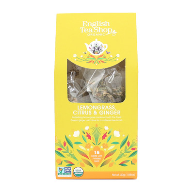 Lemongrass, Citrus & Ginger fra English Tea Shop er en økologisk teblanding med ingefær, sitron- og appelsinskall som gir en lekker, frisk smak med en krydret tone. Teen leveres individuelt pakket i 15 fine pyramideposer, håndpakket i en flott, komposterbar pappeske.