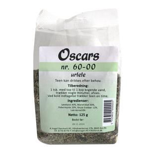 Urteteen inneholder løvetann, marie tistel, peppermynte, knuste einebær og lakris rot. Oscars te er laget av naturen lege Oscar Christensen, Skive, basert på erfaringer fra et langt liv som terapeut.