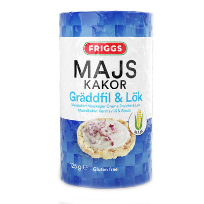 Friggs Sour Cream Onion Corn Cakes er sprø maiskaker med smak av rømme og løk. De er laget av puffede maiskjerner. Produktet er glutenfritt og egner seg som et lett mellommåltid eller som et alternativ til chips. Smaken er mild og avrundet med toner av løk og rømme for en balansert snackopplevelse.
