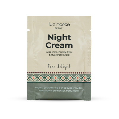 Luz Norte Night Cream er uten parfyme og passer for sensitiv, tørr, moden og normal hud. Den har en beroligende og fuktighetsgivende effekt og hjelper huden med å gjenvinne sin naturlige balanse i løpet av natten. Alle Luz Norte-produkter er utviklet og produsert i Danmark med naturlige ingredienser og basert på økologisk aloe vera i stedet for vann.