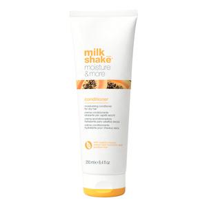 Milk_shake Moisture & More Conditioner er en fuktighetsgivende balsam for tørt hår. Balsamen opprettholder hårets naturlige fuktighetsbalanse og beskytter hårfargen mot å falme. Balsamen inneholder papayaekstrakt for et vakkert, glansfullt og sunt hår. Moisture & More balsam har et høyt innhold av hyaluronsyre, som mykgjør håret og gjør det mer mottakelig for fukt.