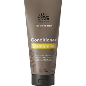 Camomile Conditioner fra Urtekram er en pleiende hårbalsam spesielt utviklet til blondt hår. Den inneholder kamilleolje og virksomt urteavkok fra kamilleblomst, som har en naturlig lysnende effekt på håret uten å virke uttørkende. En intensivt fuktgivende kombinasjon av aloe vera, lecithin og glycerin sikrer deg et silkemykt og luftig hår, som er lett å gre ut. Som en ekstra bonus er balsamen sertifisert vegansk og ikke testet på dyr.