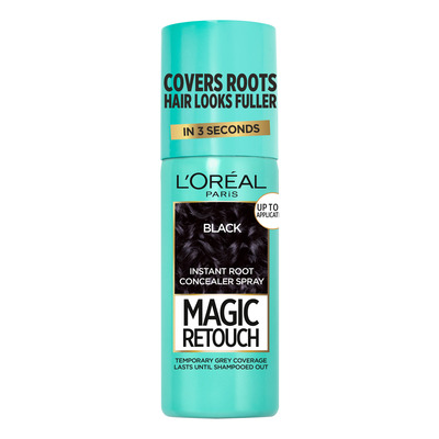 L'Oréal Paris Magic Retouch Roots 1 Black skjuler grått og svart hår.