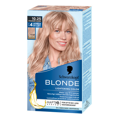 Schwarzkopf 10.25 Strawberry Blonde er en revolusjonerende hårfarge som kombinerer intens lysning og farging i ett. Den unike 2-i-1-formelen er utviklet for å lysne håret i opptil 4 nivåer for et imponerende, strålende blondt resultat. HaptIQ-systemet, som er basert på avansert molekylær hårforskning, skaper nye mikrobindinger i håret. Dette styrker håret og reduserer hårbrudd med opptil 90 %. Fargen Strawberry Blonde gir en vakker rødblond nyanse, perfekt for den trendbevisste forbrukeren.