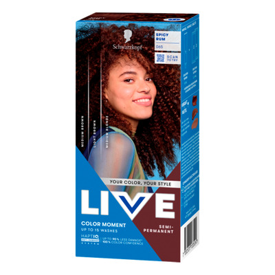 Schwarzkopf LIVE Color Moment 65 Spicy Rum er en semipermanent ammoniakkfri hårfarge med en vegansk formel. Den gir intens farge eller myke pasteller, avhengig av om du bruker fargen alene eller blander den med den medfølgende balsamen. Fargen passer til mellomblondt til mellombrunt hår og er enkel å påføre hjemme.