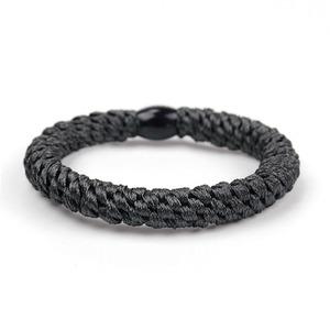 Mørkegrå hårstrikk laget av en kraftig strikk dekket med et fint farget bånd