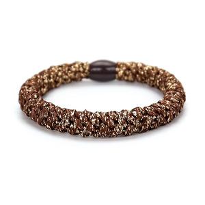 Denne fine hårstrikken er laget i det svært populære vridd design, som er laget med en sterk strikk som er trukket med et farget bånd. Strikken er med på å piffe opp antrekket ditt, samtidig som det holder håret på plass. Den kan brukes i både tykt og tynt hår, og vridd rundt håret så mange ganger du vil til det har ønsket hold på håret. Denne strikken er laget i en brun farge med glimmer.