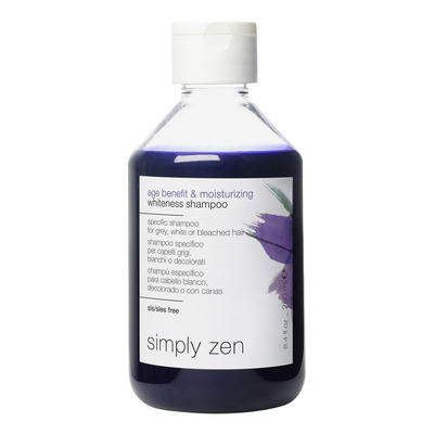 Simply Zen Age Benefit & Moisturising Whiteness Shampoo er en sølvsjampo som er spesielt utviklet for grått, blondt eller lysnet hår. Sjampoen er beriket med blå og fiolette pigmenter som bidrar til å nøytralisere gylne toner i håret, slik at håret får en kjøligere og lysere farge. Den inneholder også proteiner, planteekstrakter og et UV-filter som gir næring og beskyttelse til håret.