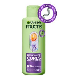 Garnier Fructis Method for Curls Pre-Shampoo er det første trinnet (N°0) i Fructis Method for Curls-programmet, som er utviklet for å skjemme bort krøllete hår med inngående fuktighet. Pre-shampooen er formulert med et 20 % fuktkompleks og inneholder hyaluronsyre og sheafettsyrer som tilfører håret fuktighet i opptil 100 timer.