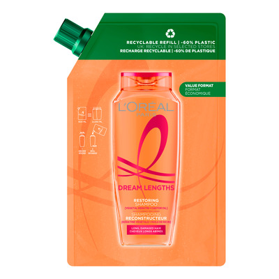 L'Oréal Paris Elvital Dream Length Shampoo Refill er en gjenoppbyggende sjampo for langt, skadet hår. Denne bærekraftige refillen inneholder 60 % mindre plast enn en 250 ml flaske. Formelen er beriket med vegetabilsk keratin, vitaminer og ricinusolje for å gi næring og styrke håret fra rot til spiss. Den bidrar til å redusere slitte tupper og gir håret et sunnere og mer glansfullt utseende.