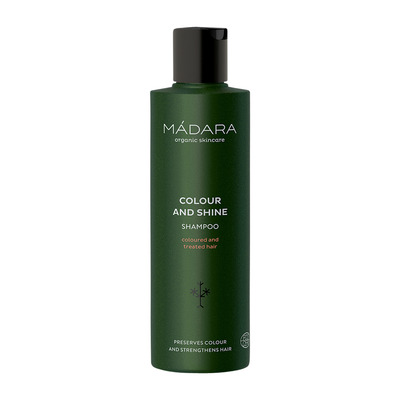 Madara Shampoo Colour & Shine er en shampoo som passer til normalt, farget og behandlet hår. Denne shampooen beroliger hodebunnen og hindrer tørre tupper. Den etterlater håret skinnende og gjør det lettere å gre håret ut.