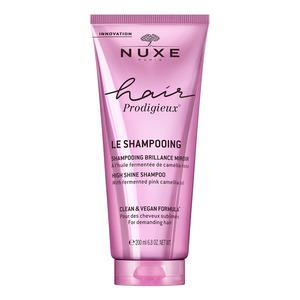 Nuxe Brillance Miroir Shampoo er formulert med fermentert rosa kameliaolje som gir næring til håret og etterlater det strålende. Sjampoen renser håret skånsomt uten å tynge hårfibrene, siden den er fri for silikon og sulfater. Den melkeaktige konsistensen og duften av den ikoniske Huile Prodigieuse gir en luksuriøs opplevelse i dusjen.