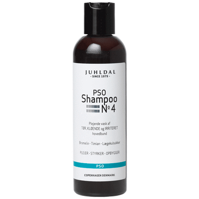 Juhldal PSO Shampoo No. 4 er designet for å hjelpe de som har en sensitiv hodebunn. Til fremstillingen av PSO Shampoo nr.4 brukes kun de mest effektive naturlige stoffene og den viktigste ingrediensen er naturlig bromelin som har vist seg å være effektiv mot spesielt tørr og flassende hodebunn.