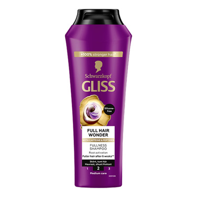 Schwarzkopf Gliss Full Hair Wonder Shampoo er spesielt utviklet for tynt og skjørt hår. Den unike formelen med koffein og peptider fremmer vekstfaktorer og styrker hårrøttene, og gjør håret fyldigere etter bare 6 uker. Sjampoen etterlater håret sterkere og sunnere med mindre avbrekk ved regelmessig bruk.