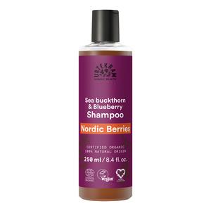 Urtekram Nordic Berries Shampoo er en prisvindende reparerende shampoo inneholder havtorn, blåbær, tranebær og nype som er fulle av vitaminer og antioksidanter. Kombinert med hyauronsyre gir de en fantastisk næring og fukt til håret. Pilebarkekstrakt understøtter revitaliseringen av hudens balanse og forsterker effekten av de øvrige planteingrediensene.