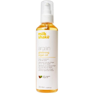 Milk_Shake Argan Oil er laget på økologisk arganolje som pleier og nærer håret i dybden. Oljen er velegnet til alle hårtyper og etterlater håret gjennomfuktet og silkebløtt. Oljen gjør håret glansfullt og volumiøst, samt bekjemper krus. Arganoljen forkorter også tørketiden ved føning. Oljen tilfører en deilig, mild og luksuriøs duft til håret.