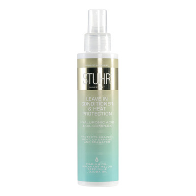STUHR Styling Hyaluronic Acid Leave-in Conditioner & Heat Protection er en multifunksjonell varmebeskyttende leave-in-spray som beskytter mot varme fra stylingelektronikk, UV-stråler og sjøvann. Den forbedrer hårets kvalitet, håndterbarhet og glans umiddelbart og reduserer frizz. Håret blir fuktigere, mykere og lettere å gre gjennom. Oljene i formelen tilfører næringsstoffer, antioksidanter, vitaminer og fettsyrer til hår og hodebunn.