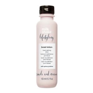 Lifestyling Braid Lotion fra Milk_Shake er en styling lotion for fletter og knutefrisyrer. Lotionen gir glans til håret og gjør det lettere å flette håret til vakre frisyrer. Stylinglotionen har en fin konsistens som sørger for at flettene og knutefrisyrene dine varer hele dagen. Denne flettekremen inneholder quinoaproteiner og epleekstrakt som effektivt nærer og fukter håret.