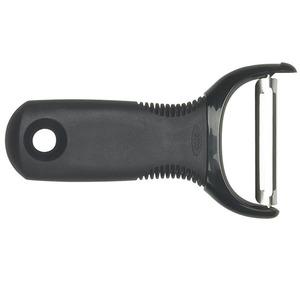 Y-peeler har et skarpt skjæreblad i rustfritt stål og en innebygd øyefjerner.