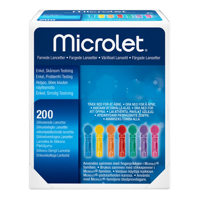 MICROLET®-lansettpinner leveres i pakker med 200 stk. i sju forskjellige farger. Lansettene er beregnet til engangsbruk, og det anbefales å bytte lansett etter hver blodprøve. De ulike fargene kan hjelpe deg med å huske å skifte lansett hver gang. Lansettene brukes sammen med MICROLET®NEXT-fingerstikk.