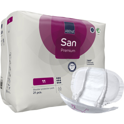 Abena San-serien er pustende og anatomisk formede bleier som gir rask absorpsjon og en tørr overflate takket være den effektive kjernen med Top-Dry-teknologi. Bleiene kan brukes ved alvorlig til moderat inkontinens.