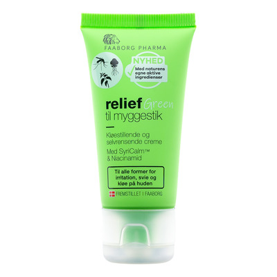 Faaborg Pharma Relief Green mot myggstikk er en kløestillende og selvrensende krem med naturens egne ingredienser. Kremen lindrer kløe, svie og hevelse etter insektstikk, brennmaneter og brennesle. Relief Green inneholder Syricalm og Niacinamid, som er kjent for sine beroligende og beskyttende egenskaper. Kremen er ideell for alle typer irritasjon, svie og kløe på huden.