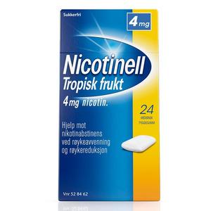 Nicotinell tyggegummi 4mg tropisk frukt er et reseptfritt legemiddel til hjelp for deg som vil slutte å røyke. Brukes ved nikotinabstinens, ved røykeavvenning og røykereduksjon