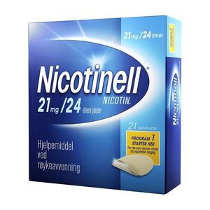 Nicotinell depotplaster 21mg/24t - 21 stk er et reseptfritt legemiddel til hjelp for deg som vil slutte å røyke. Brukes ved nikotinabstinens, ved røykeavvenning og røykereduksjon