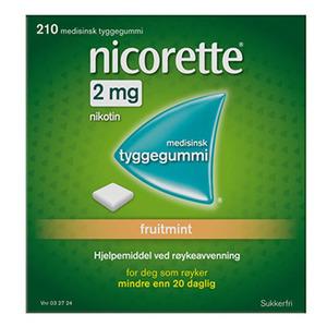 Nicorette tyggegummi 2mg fruitmint er et reseptfritt legemiddel til hjelp for deg som vil slutte å røyke. Brukes ved nikotinabstinens, ved røykeavvenning og røykereduksjon