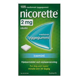 Nicorette tyggegummi 2mg icemint er et reseptfritt legemiddel til hjelp for deg som vil slutte å røyke. Brukes ved nikotinabstinens, ved røykeavvenning og røykereduksjon
