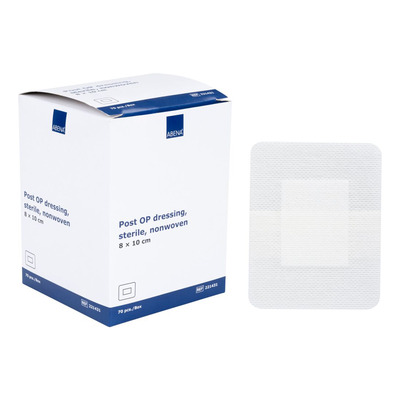 Abena Post-Op Bandasje, 8 x 10 cm, er en steril og fleksibel bandasje som egner seg som primærbandasje på tørre og lett væskende sår. Bandasjen har en myk nonwoven-bakside med en hudvennlig akrylkant som sikrer god passform uten å irritere huden. Den sentrale sårputen er laget av myk polyester, som absorberer væske effektivt og ikke kleber seg til såret. Materialet lar huden puste gjennom bandasjen.