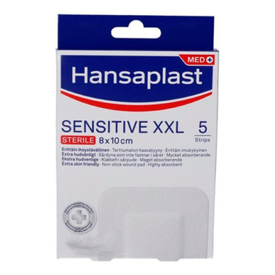 Hansaplast Sensitive XXL er en pakke med 5 hudvennlige plaster som egner seg for mellomstore og store sår