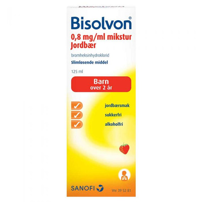 Bisolvon mikstur 0,8 mg/ml jordbær er et reseptfritt legemiddel beregnet til korttidsbehandling av seigt slim (bronkialsekret) i forbindelse med vedvarende luftveissykdommer.