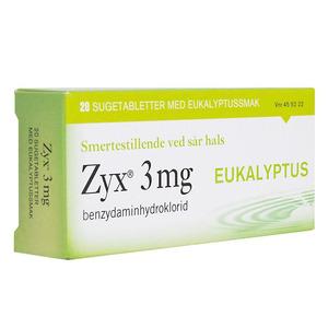 Zyx, med smak av eukalyptus, er en smertestillende sugetablett. Det aktive virkestoffet er Benzydamin som har en lett lokalbedøvende effekt. Zyx virker lindrende på irritasjon og smerter i munn, svelg og hals ved forkjølelse og vondt i halsen.