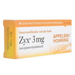 Zyx, med smak av appelsin/honning, er en smertestillende sugetablett. Det aktive virkestoffet er Benzydamin som har en lett lokalbedøvende effekt. Zyx virker lindrende på irritasjon og smerter i munn, svelg og hals ved forkjølelse og vondt i halsen.