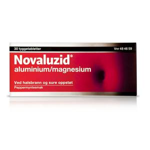 Novaluzid tyggetabletter er et reseptfritt legemiddel med syrenøytraliserende effekt til bruk ved overskudd av magesyre, halsbrann, magesår og magekatarr.