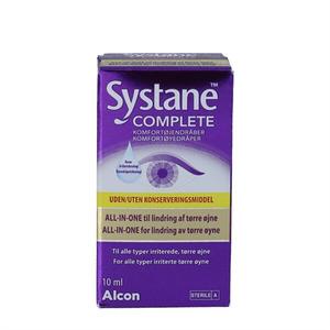 Systane COMPLETE Comfort Øyedråper, uten konserveringsmidler, gir effektiv lindring for alle som opplever tørre eller irriterte øyne. Disse avanserte øyedråpene er utviklet for å behandle symptomer som svie og prikking ved hjelp av lipiddråper i nanostørrelse som fordeler seg jevnt over øyets overflate. Formelen virker aktivt beroligende, fuktighetsbevarende og gjenoppbyggende på cellene, noe som sikrer økt fuktighet og langvarig smøring og beskyttelse av alle lag i tårefilmen. Øyedråpene er spesielt godt egnet for kontaktlinsebrukere, da de kan brukes både før linsene settes inn og etter at de er tatt ut.