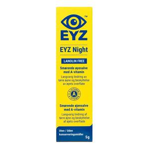 EYZ NIGHT Øyesalve er en smørende og fuktende øyesalve med A-vitamin (retinylpalmitat), utviklet for langvarig lindring ved tørre og irriterte øyne. Produktet danner en beskyttende hinne som bidrar til å stabilisere tårefilmen og lindre symptomer som svie, tørrhet og rødhet.