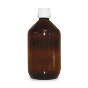 Brun tom flaske med hvitt skrulokk fra Mezina. Flasken kan inneholde 500 ml.